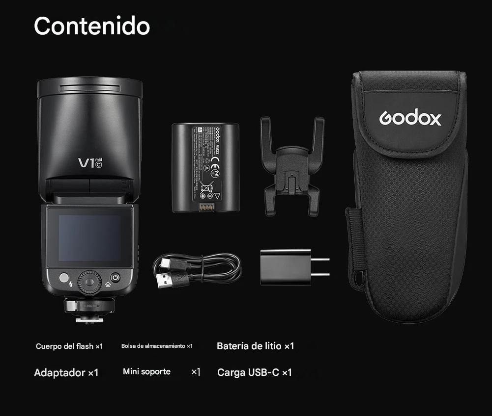 Alimentado por una batería recargable de litio de 7,2 V y 2200 mAh incluida, con un tiempo de recarga de 1,7 segundos, el V1mid permite 650 destellos a máxima potencia y una duración de entre 1/600 y 1/20 000 s. Otra característica destacada es su lámpara de modelado LED integrada de 2 W con una temperatura de color de 5300 K (+/- 200 K) y brillo ajustable (1-10). Los indicadores de batería en la pantalla indican el nivel de batería restante. Godox incluye el cable de carga USB-C y el adaptador en la caja.