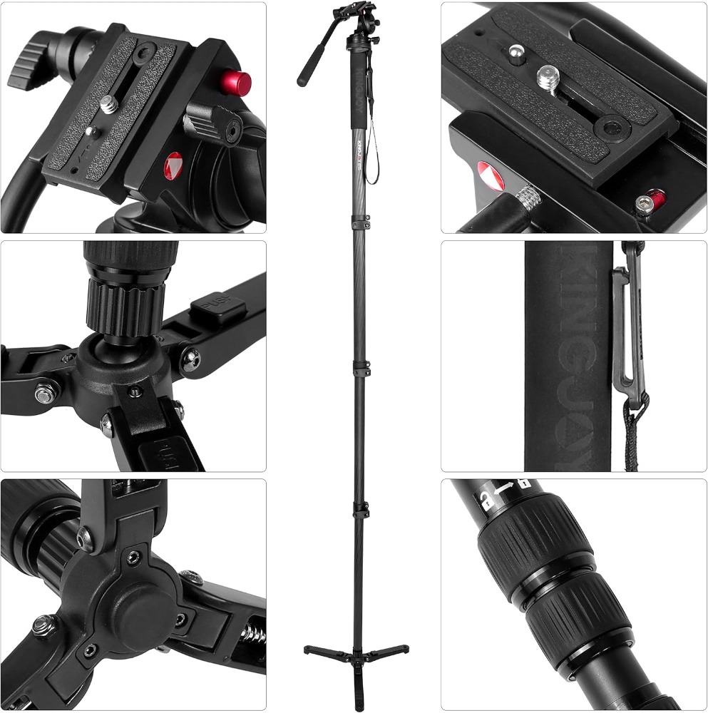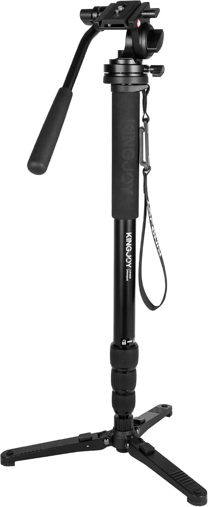 El monopie de la serie """Alegría de la libertad" es el producto recién desarrollado de Kingjoy, que es multifuncional y ampliamente utilizado para la fotografía deportiva, la observación de aves y la película micro. La placa de carga monopod adopta tornillo de montaje de cabeza convertible dual de 3/8 ""-1/4". Las cámaras y el equipo de observación de aves se pueden montar directamente con un tornillo roscado de 1/4" para permitir un ajuste adecuado con diferentes cabezas. Características: monopie de vídeo de aluminio de alta resistencia con cabezal desmontable para trípode para proporcionar un soporte sólido, con máx. capacidad de carga de hasta 10 kg. Soporte giratorio de 360 grados con patas de base del Monopod permite un ajuste libre de panorámica e inclinación durante el rodaje de vídeo o micro película. Soporte plegable de tres pies de diseño monopie para facilitar su transporte con la bolsa incluida. El diseño de barra de mango portátil y antideslizante puede evitar que el disparo se sacude para mejorar la estabilidad. Los tornillos UNC1/4" y UNC3/8" pueden ser convertibles y fijados rápidamente utilizando la llave Allen incluida en la placa de carga, lo hacen adecuado para todas las cámaras DSLR videocámaras y cabezas de bola. O puede montar otro equipo en el monopie como cabeza de bola, cabeza de vídeo y así sucesivamente. Cabezal fluido KH-6750 equipado para la observación de aves o la astronomía. Especificaciones: secciones: 4 secciones, diámetro de la pierna: 31,4 mm, altura extendida: 172,5 cm, altura plegada: 64 cm, peso: 1,37 kg. Máx. Carga: 10 kg